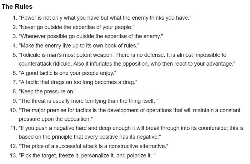 Being a good leftist, I was sure he would recognize it as Saul Alinsky’s rules for radicals. Much to my surprise, he just agreed with it (shocker). Commented that he thought is sounded like Sun-tsu.